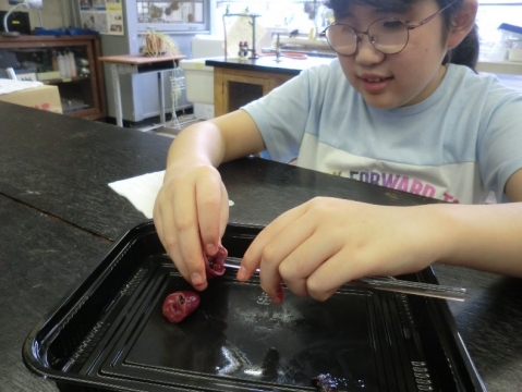 動物の心臓のつくりの学習では、ニワトリの心臓「ハツ」を実際に使って確かめます。心臓の中の心室は血管につながっていることをガラス棒で確かめました。