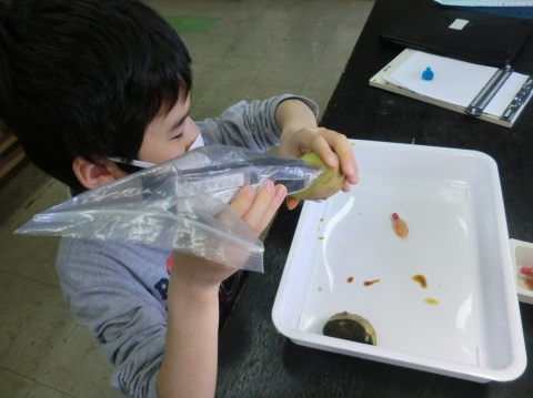 ヨウ素液を使ってジャガイモにデンプンがあるかを確かめます。「感光器」というセンサーを使い、音でヨウ素液の色の変化をチェック!