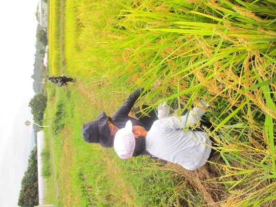アスクの従業員のみなさんに鎌の動かし方を教えてもらい、稲の茎の束を握っては「ザクザク」と一生懸命刈り取っていきました。稲穂は重く、秋の実りを感じました。