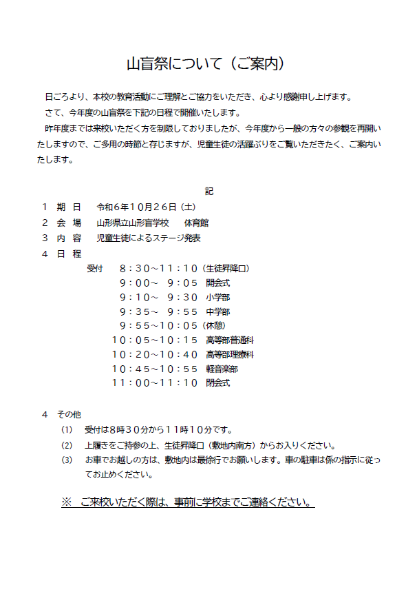令和6年度山盲祭のご案内 2024年9月27日 10時44分 [WEB担当] 令和6年度の山盲祭についてご案内いたします。今年度から一般の方々の参観を再開いたしますので、みなさまぜひお越しください。 R06山盲祭案内(学校HP用).pdf