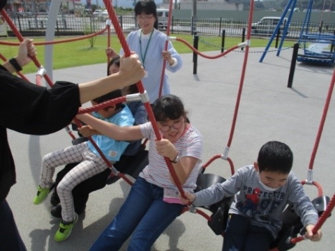 目的地の山形市遊戯施設「コパル」では、巨大な滑り台、ひのき玉のボールプール、ネット遊具、3人で乗れるブランコなどを楽しみました。遊びに来ていた他のお子さんとふれ合う場面もありました。