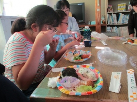 昼食は、コパル近くの寄宿舎で、みんなでお弁当を食べました。それぞれが買ってきたおやつも食べて楽しいひとときとなりました。寄宿舎の児童はここでお別れ。自宅に帰る児童はスクールバスで学校へ戻りました。