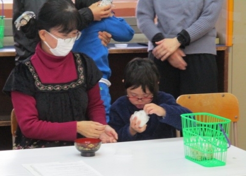 3・4年2組は、おにぎりづくりを実演。自分たちの好きなおにぎりの具も紹介しました。