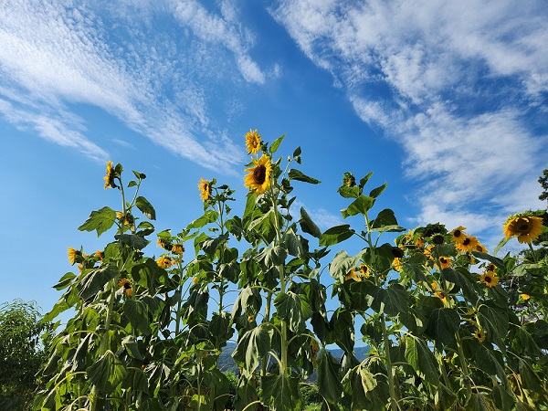 プールの脇の観察園のひまわりは夏の強い日差しに向かってぐんぐん背を伸ばし大きな花を咲かせています